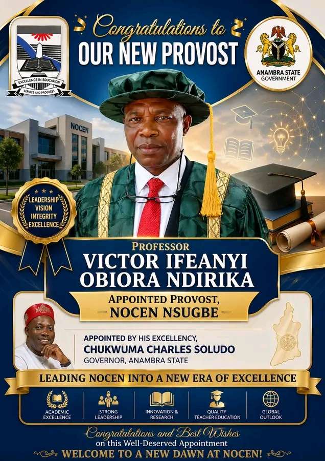 The Governor of Anambra State, Professor Chukwuma Charles Soludo, CFR, has appointed Professor Victor Ifeanyi Obiora Ndirika, a renowned Agricultural Engineer and eminent scholar, as the new Provost of Nwafor Orizu College of Education, Nsugbe.