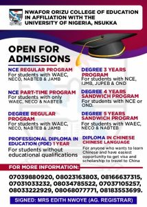 ADMISSIONS NOW OPEN! Nwafor Orizu College of Education, Nsugbe — in affiliation with the University of Nigeria, Nsukka — invites applications for:...